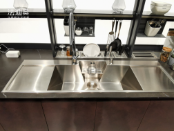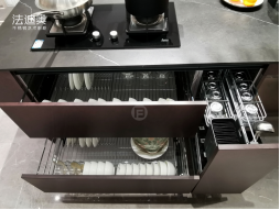 法迪奥依据这个使用习惯,开发了一体式不锈钢台面,把后挡水条加高到270mm,设置里整套后档收纳系统。