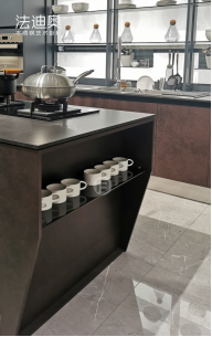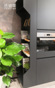 法迪奥第六代厨柜在中岛设计了置物架,配置可移滑槽式充电插座,方便主人在这里刷手机、看电视、看书、听歌、美食直播。