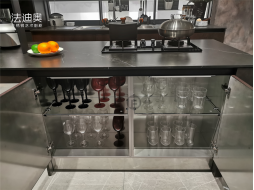 炉灶的下方、碗碟拉篮的外侧做了浅柜,存放常用的酒具、茶具、碗碟甚至是充电数据线,坐在吧台时不必绕道去拿。