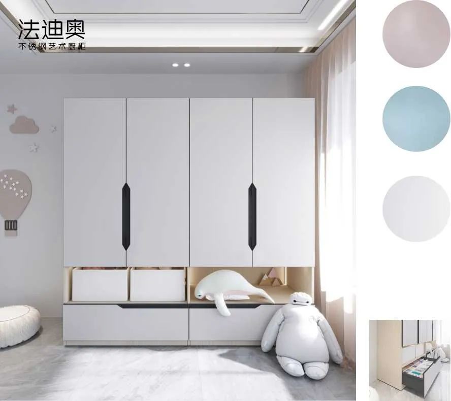 关注儿童健康,针对儿童收纳需求、使用习惯,法迪奥推出不锈钢儿童衣柜。橡皮粉、天水蓝、珠光白三色样柜,定制可选更多色彩。
