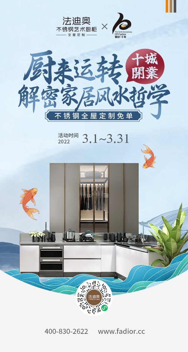 活动期间,订购法迪奥不锈钢橱柜或衣柜,额外享免单15%;