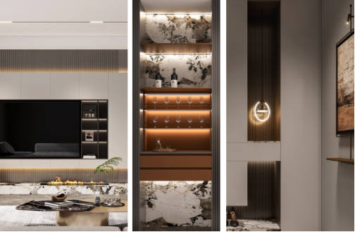 不锈钢电视柜:白杏免拉手门板、石墨灰开放格、子午灰柜体板,微粒子晶脂工艺
