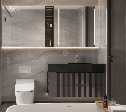 主卫浴室柜采用了线条感极强的格栅造型门板,侧边做开放格来放置卷纸,既便捷又省空间。