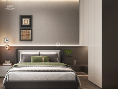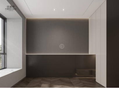 床屏采用法迪奥不锈钢护墙板工艺,右边床头柜与衣柜一体,直接做成悬浮式L型转角抽屉,避免了传统床头柜阻挡衣柜开门的问题。