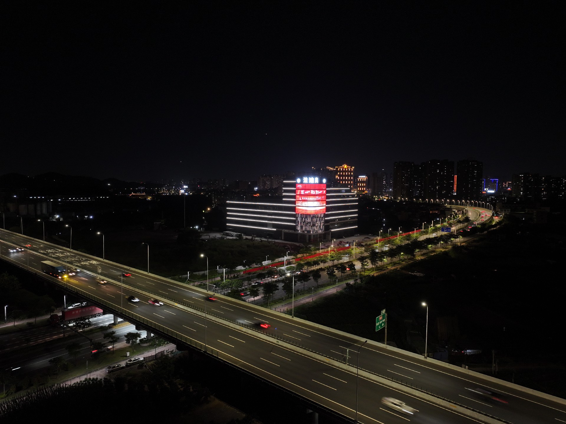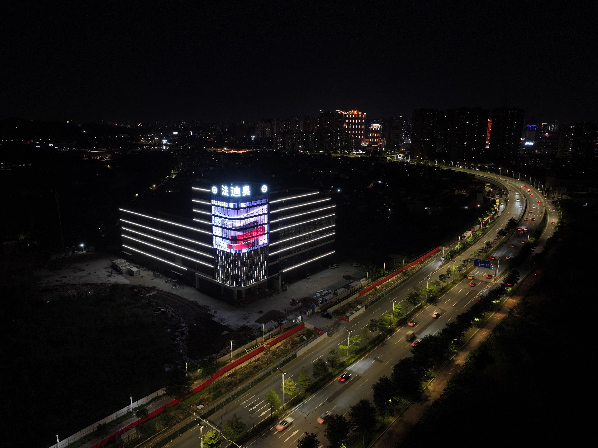 随着大楼顶部“法迪奥”LOGO的灯光亮起,大楼正面LED巨幕播出祖国成立75周年的祝贺视频。耀眼的光芒照亮城市夜空,在广珠西线高速上竖起不锈钢高定的金字招牌。
