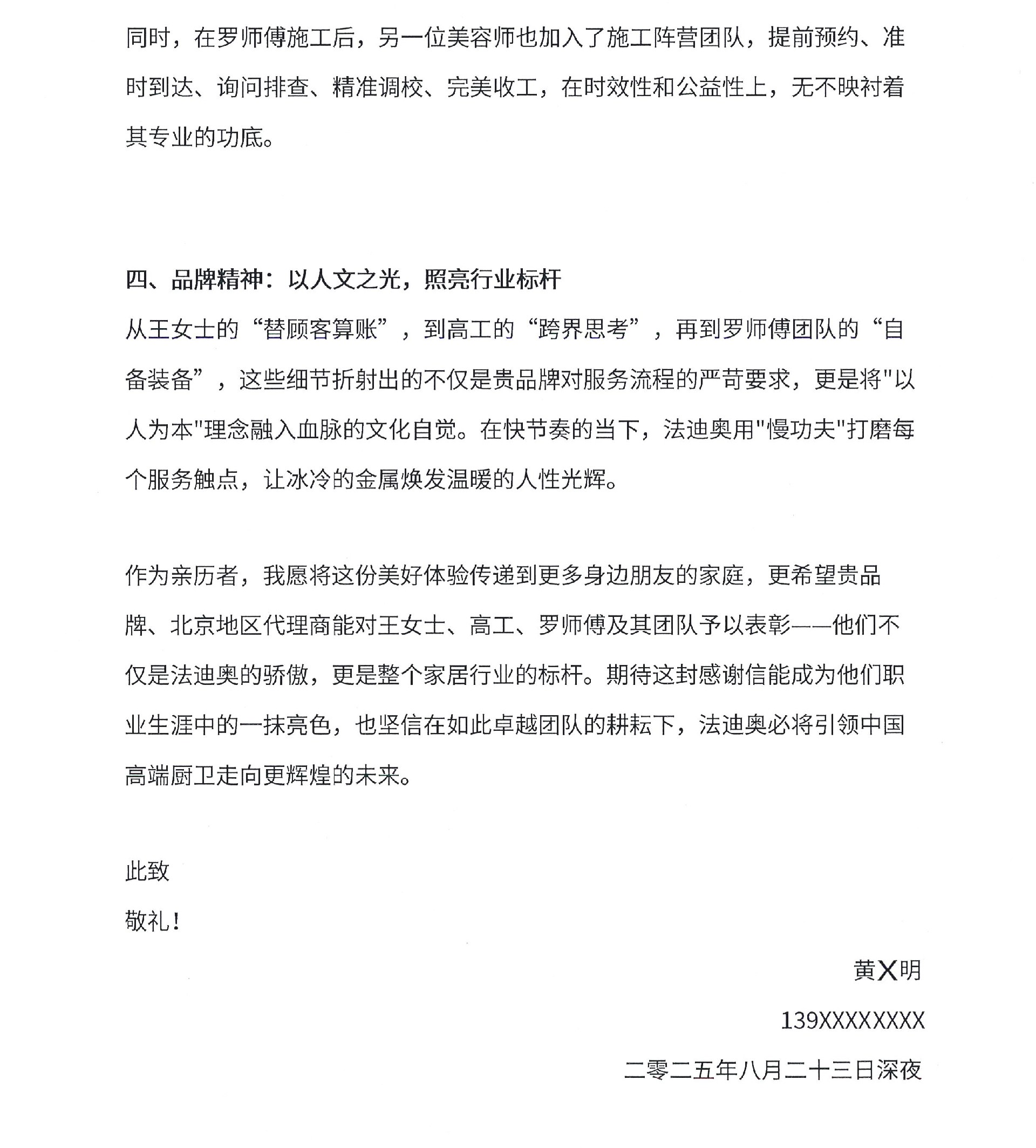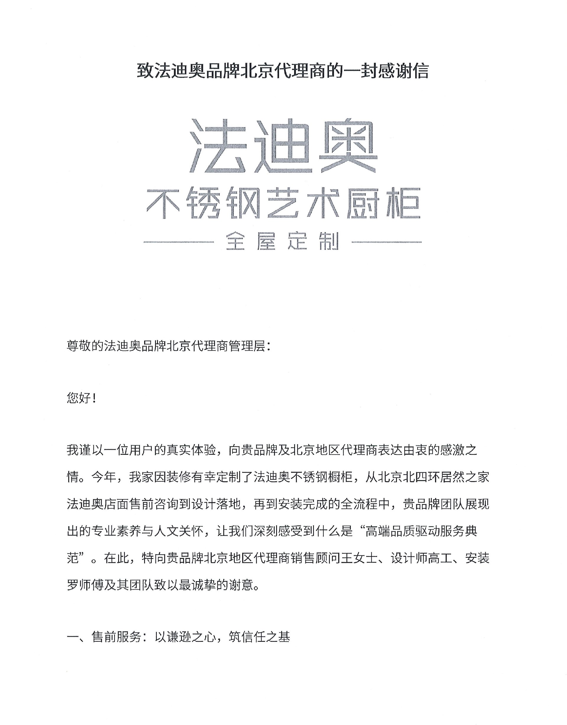 近日,法迪奥收到了一封来自北京客户的深情感谢信。